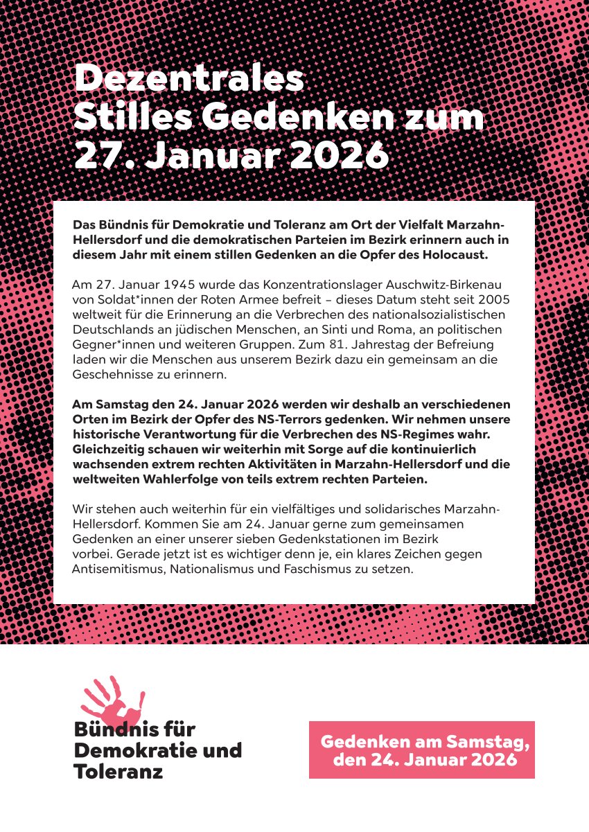 24.01.2026 um 10:00 – 15:00 Dezentrales Gedenken in Marzahn-Hellersdorf Dezentrales Stilles Gedenken: 27.01. – Der Internationale Tag des Gedenkens an die Opfer des Holocaust – Am 24. Januar 2026 in […]