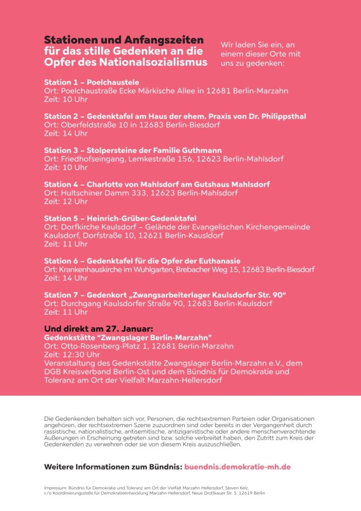 Dezentrales Stilles Gedenken: 27.01. – Der Internationale Tag des Gedenkens an die Opfer des Holocaust – Am 24. Januar 2026 in Marzahn-Hellersdorf